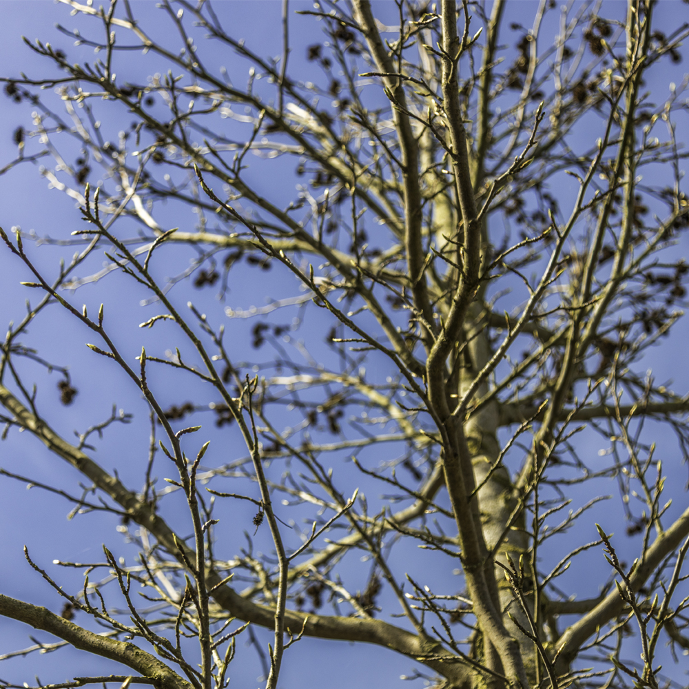 Die Blätter des Amberbaums sind charakteristisch handförmig und im Frühjahr und Sommer frischgrün. Im Herbst verwandelt sich der Baum in ein farbenreiches Bild mit Tönen von Rot, Violett und Orange. Diese intensiven Herbstfarben machen den Amberbaum ‘Lane Roberts’ zu einer wertvollen Ergänzung im Garten. Der Baum blüht im Frühjahr unauffällig und kann kleine, stachelige Früchte bilden, die im Winter an den Zweigen hängen bleiben.