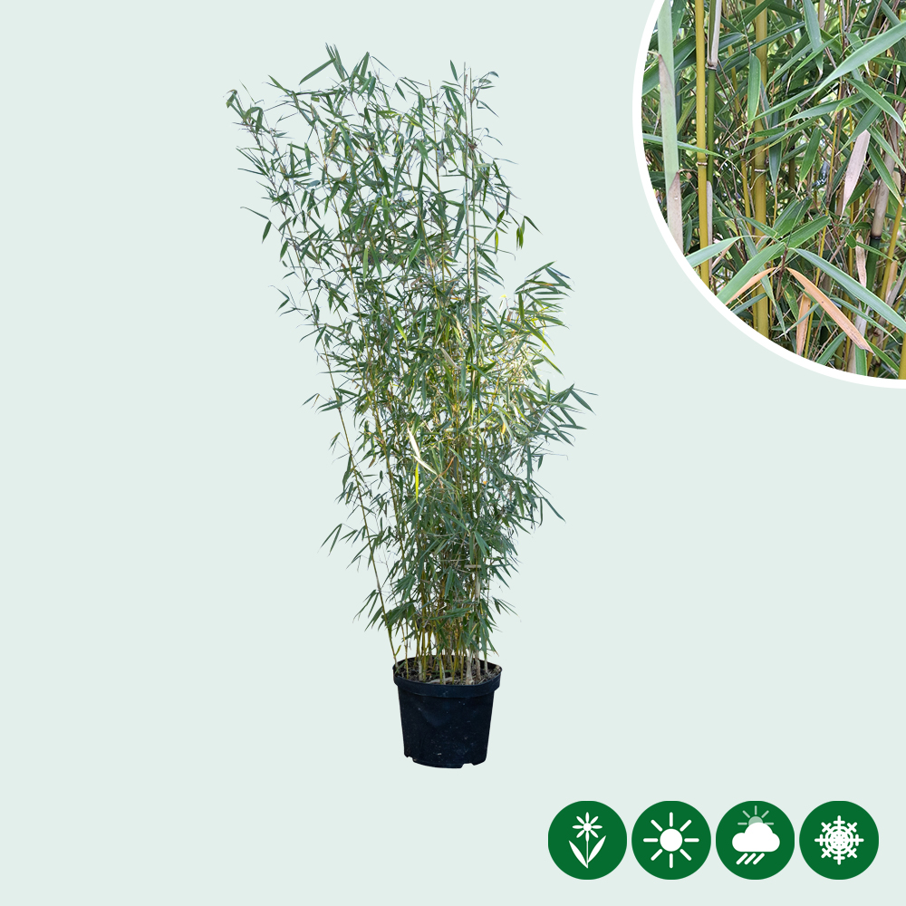 Die Fargesia robusta ‘Campbell’ ist ein kräftiger, nicht wuchernder Bambus mit einer frischen und modernen Ausstrahlung. Diese Art fällt durch ihre robusten Halme und den schönen Kontrast zwischen den dunkelgrünen Blättern und den hellen Scheidenblättern auf. Die Pflanze wächst aufrecht und bleibt das ganze Jahr über grün. Dank ihres ruhigen Wachstums und der dichten Blattstruktur ist sie eine ausgezeichnete Wahl als grüne Hecke, Sichtschutz oder Solitärpflanze im Garten.