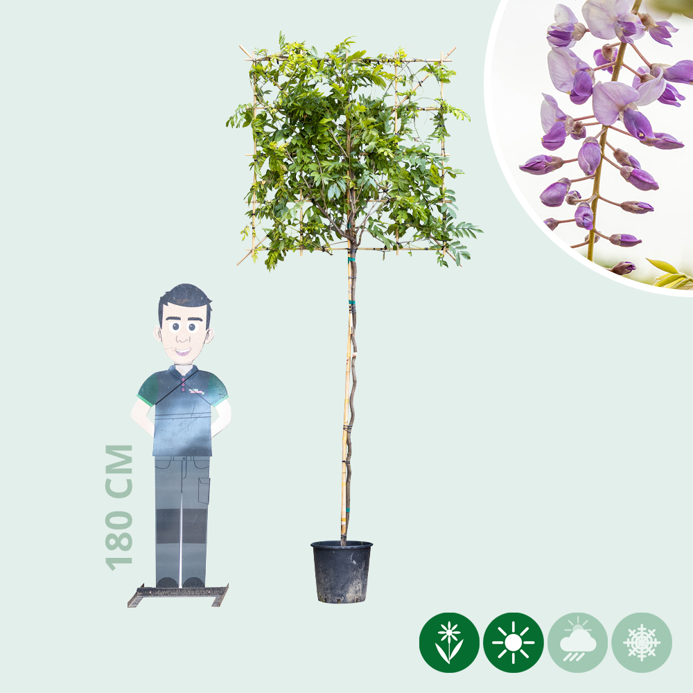 Die Blauregen als Spalier ist eine sommergrüne Kletterpflanze, die an einem Gerüst entlanggeführt wird. Im Mai zeigt sie eine reiche Blüte mit blau violetten Trauben, die einen angenehmen Duft verströmen. Manchmal folgt im September eine zweite Blüte. Das Spalier füllt sich schnell, denn der Blauregen wächst sehr kräftig. Durch die Spalierform eignet sich diese Pflanze ideal für eine Wand oder Fassade.