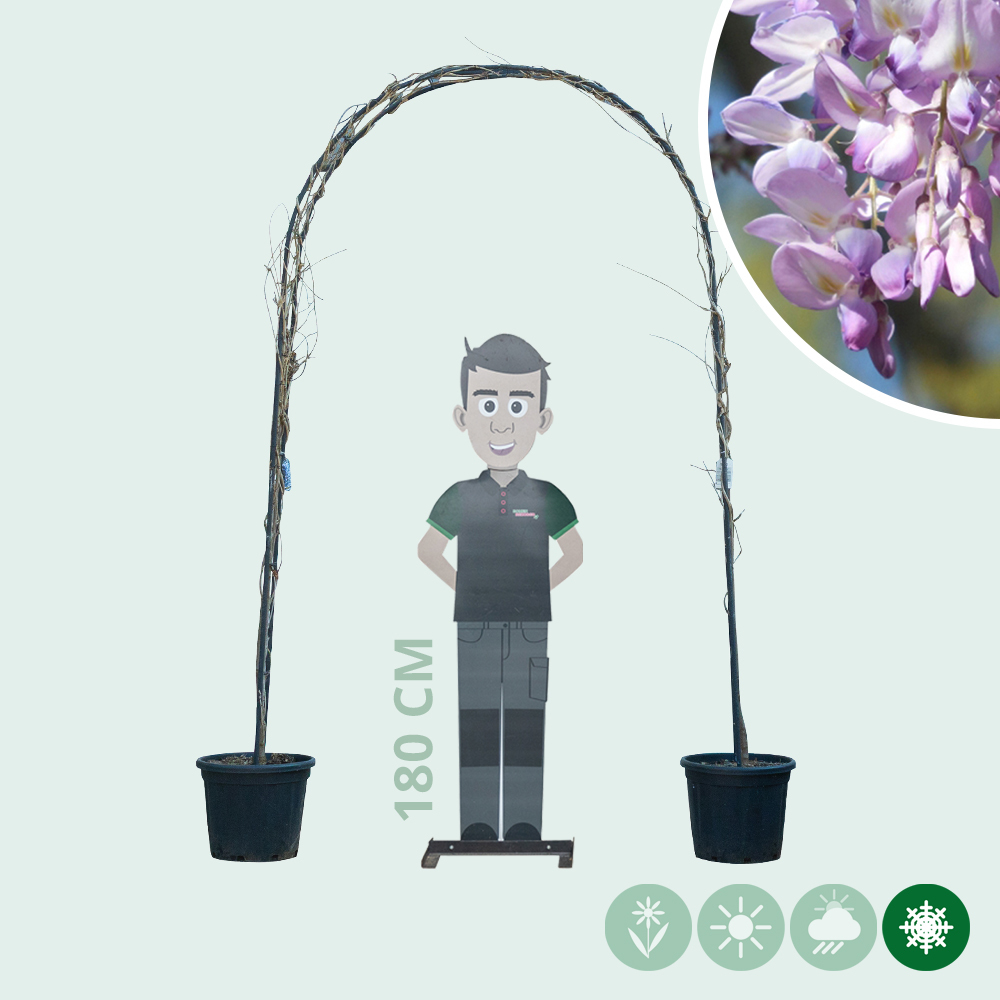Der Blauregen Bogenform ist ca. 250 cm hoch und 150 cm breit.