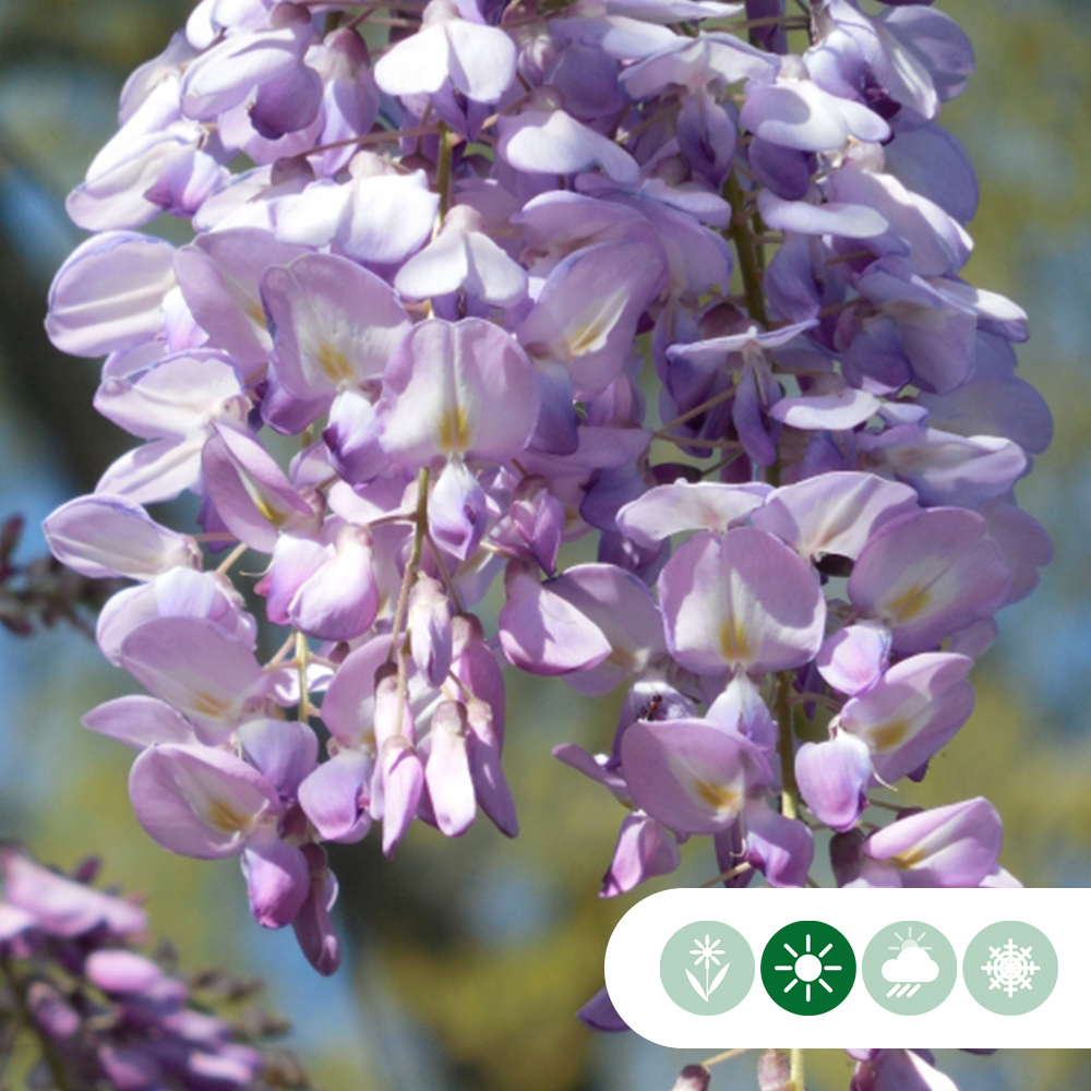Der Blauregen wächst am besten an einem sonnigen Standort und bevorzugt einen gut durchlässigen Boden. Durch einen jährlichen Rückschnitt bleibt der Bogen schön in Form und Sie fördern eine reiche Blüte im nächsten Jahr.