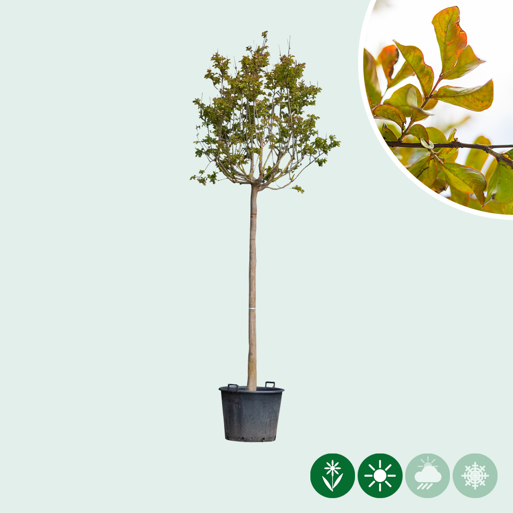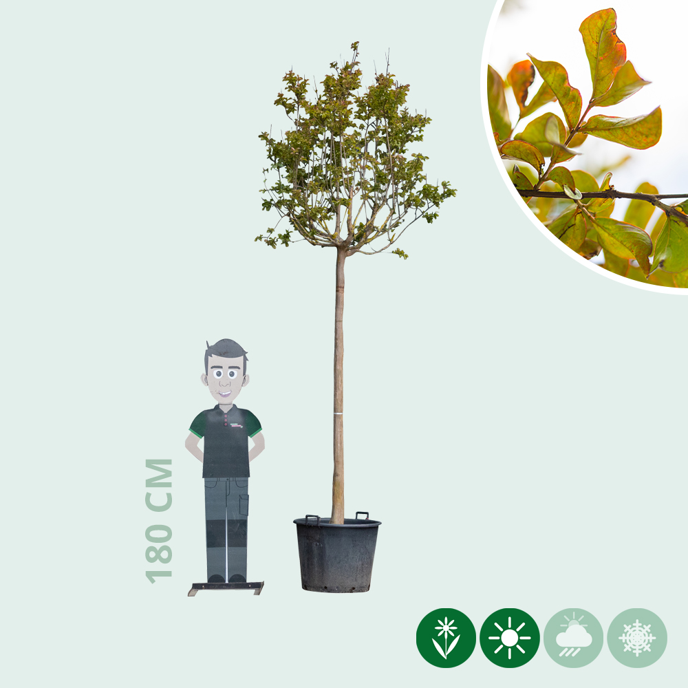 Die Chinesische Kräuselmyrte Hochstamm hat eine Gesamthöhe von 350 bis 450 Zentimetern und eine Stammumfang von 20 bis 25 Zentimetern.