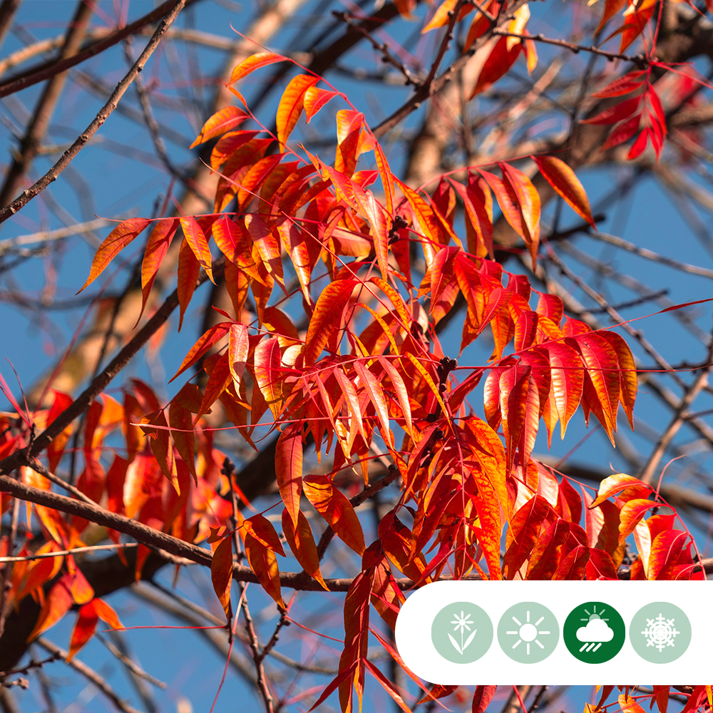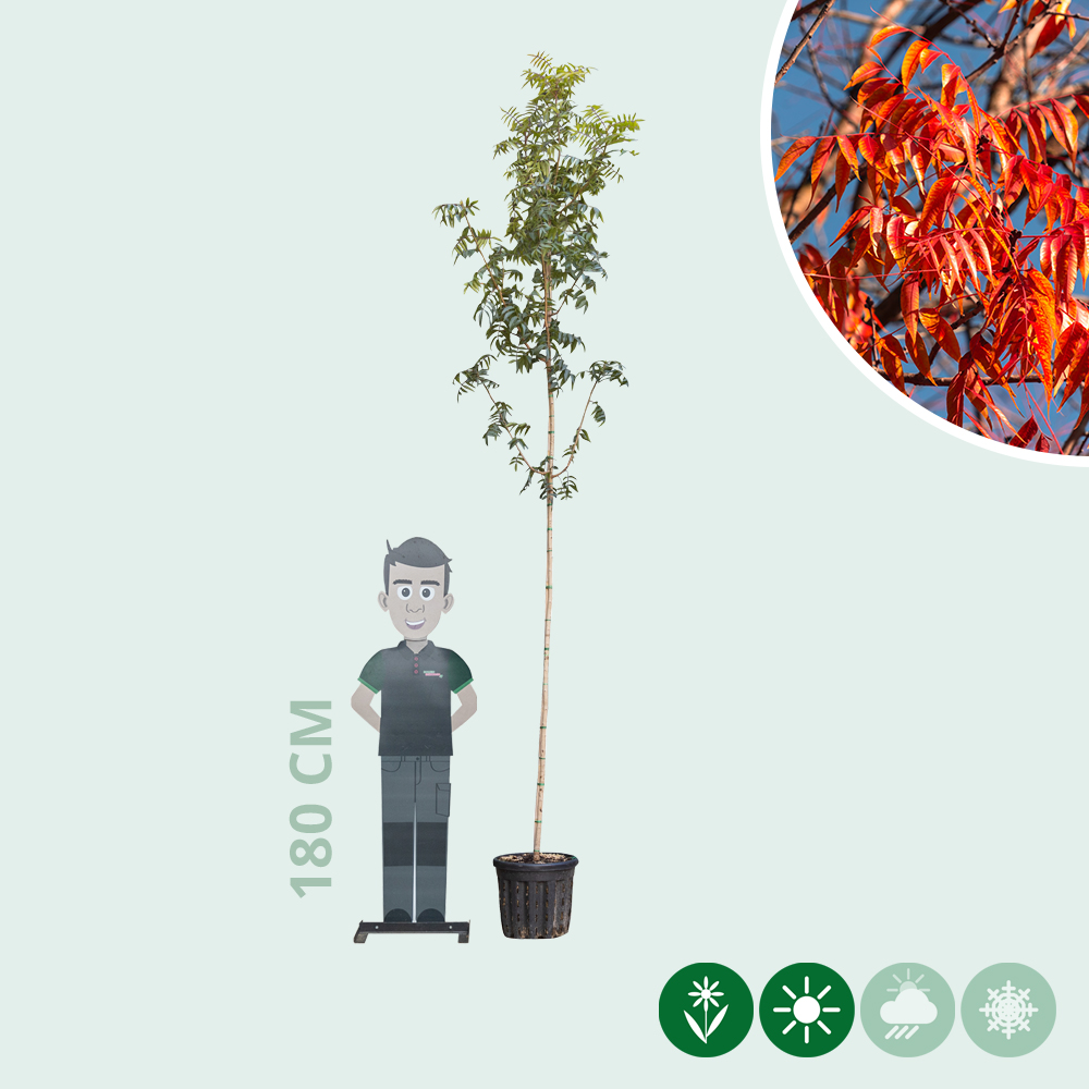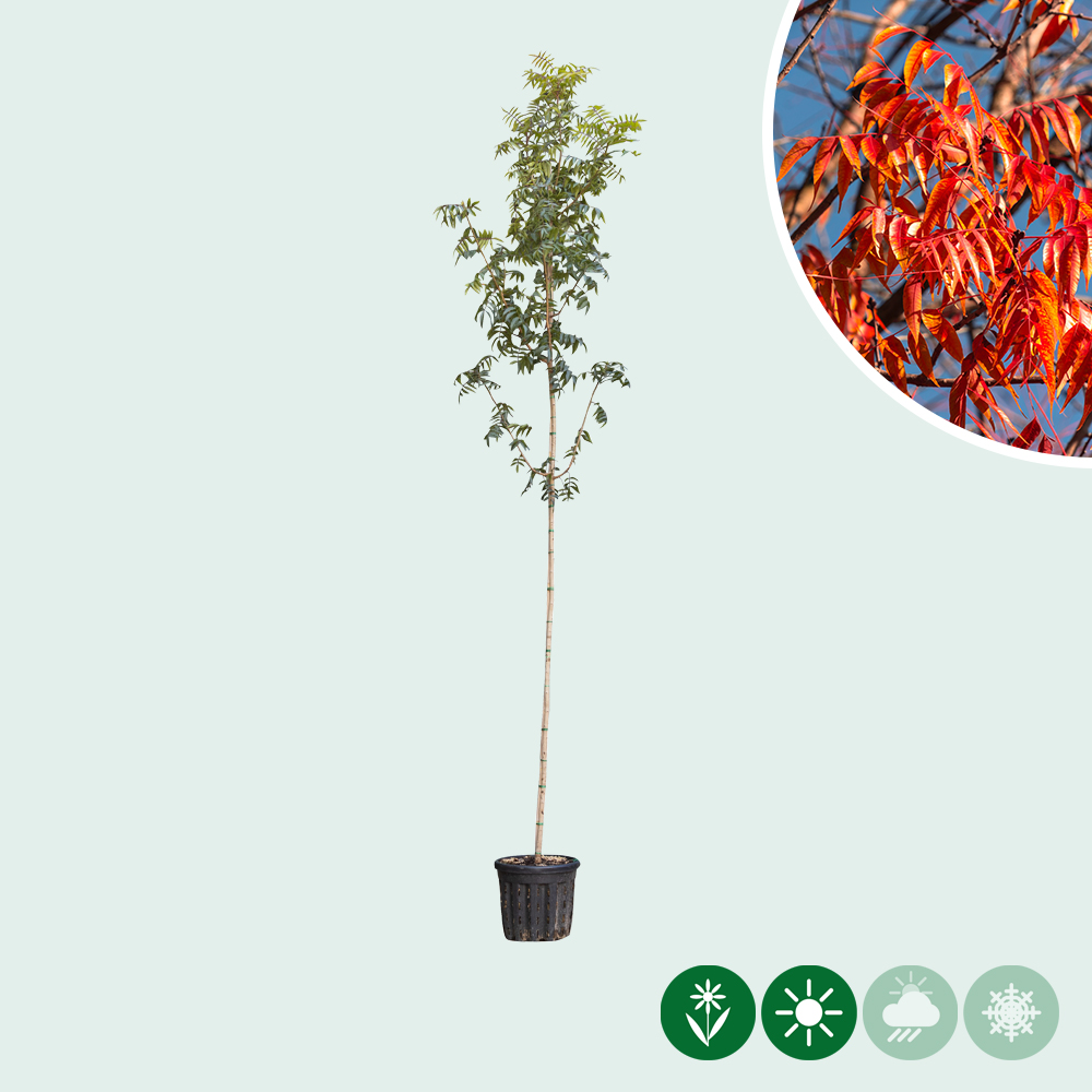 Die Pflege ist unkompliziert. Schneiden Sie am besten im späten Frühjahr, um abgestorbene Äste zu entfernen oder die Krone leicht zu korrigieren. Darüber hinaus benötigt der Baum nur wenig Pflege und ist gut winterhart. Der Chinesische Pistazienbaum als Hochstamm ist daher eine robuste, pflegeleichte Wahl für alle, die einen farbenfrohen und außergewöhnlichen Baum suchen. Mit der Pistacia chinensis holen Sie sich einen Hochstamm in den Garten, der von April bis weit in den Herbst einen beeindruckenden Anblick bietet.