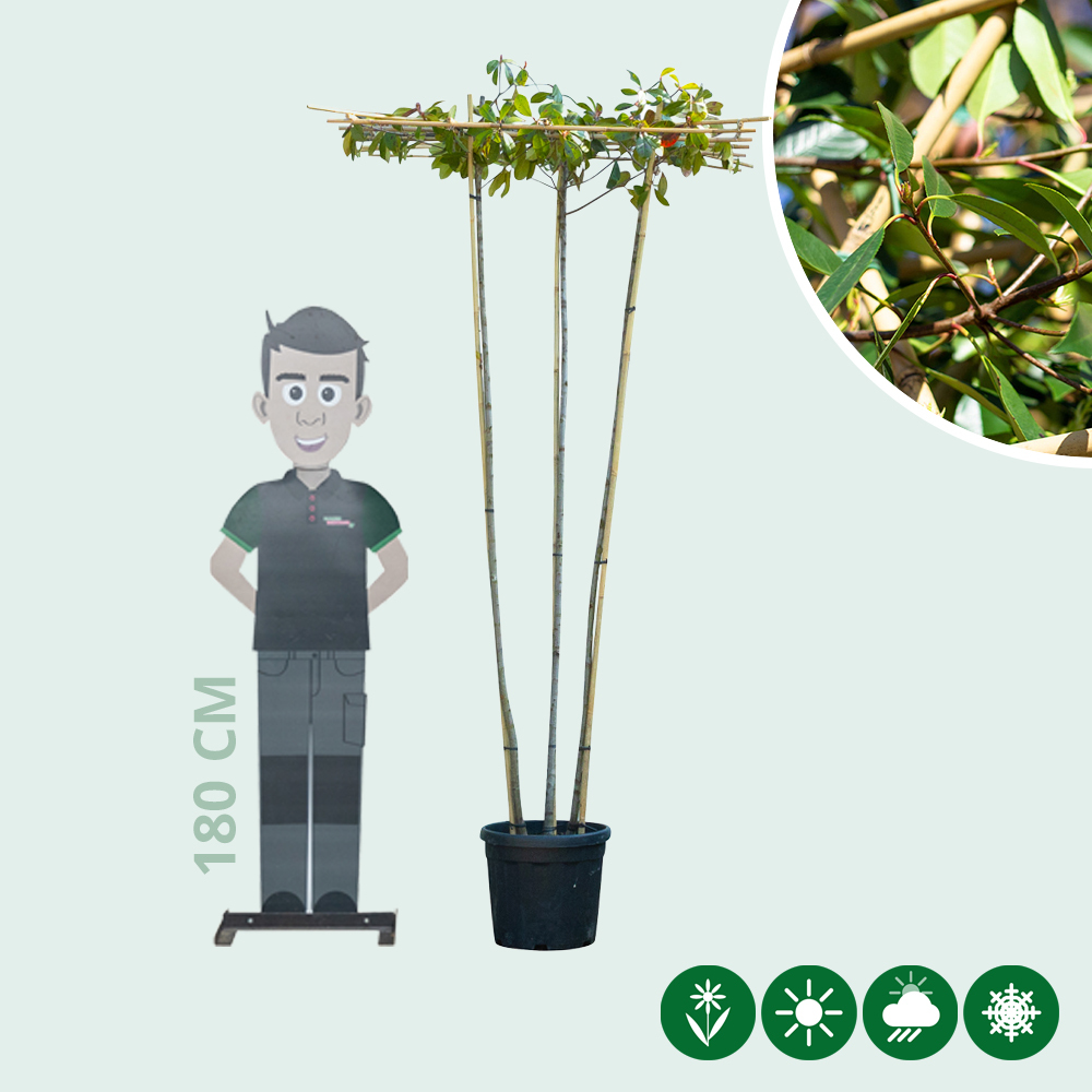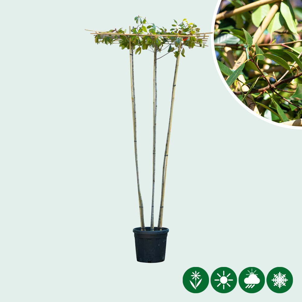 Die Dachglanzmispel ist ein wunderschöner immergrüner Dachbaum. Dieser dachförmige Baum blüht im Frühjahr mit großen weißen Blüten, die sehr angenehm riechen. Während der Blüte treiben die neuen Blätter in Bronze- und Rottönen aus. Der Austrieb der neuen Blätter erzeugt in Kombination mit der Blüte einen schönen Farbeffekt. Wie bereits erwähnt, ist die Glanzdachmispel ein immergrüner Baum mit ganzjährigen Blättern. Dies ist einer der wenigen Dachbäume im Sortiment von Baumlieferservice, die immergrün sind. Darüber hinaus ist Dachglanzmispel sehr pflegeleicht: Schneiden Sie den Baum im Mai oder Juni für ein ebenes Dach zurück. Die Dachglanzmispel ist ein Baum, der in jedem Garten gut wachsen kann und wenig Platz benötigt.