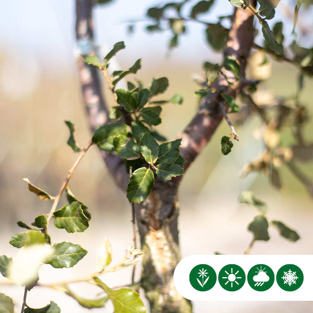 Die Blätter dieses charakteristischen Baumes sind dunkelgrün und immergrün! Ein Quercus suber verträgt kurze Frostperioden von -14 bis -16 Grad Celsius. Bei strengem Frost ist es möglich, dass die Korkeiche ihre Blätter abwirft und im Frühjahr neue Blätter bekommt. Diese wunderschöne Korkeiche wächst in Deutschland am besten an einem geschützten Ort (Schutz vor dem Nordostwind). Die besten Böden für die Korkeiche sind sandige oder kalkhaltige Lehmböden. Kurzum, ein romantischer Baum, der Ihrem Garten ein besonders warmes Ambiente verleiht.