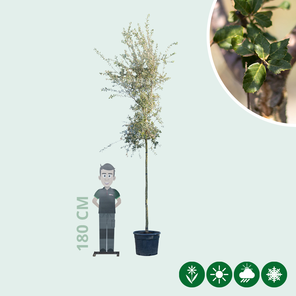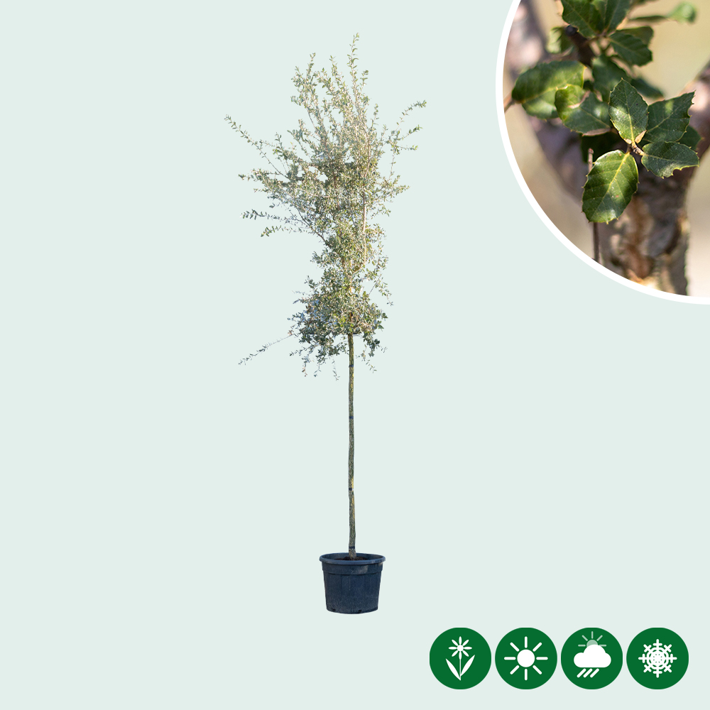 Die Korkeiche Hochstamm ist ein wunderschöner, immergrüner Baum, der durch mehrere Zierwerte deutlich sichtbar ist. Die Korkeiche hat einen schönen, groben und romantischen Stamm. Dieser Mediterrane Baum verdankt seinen Namen "Korkeiche" den weichen Korkstreifen am Stamm. Diese Korkstreifen am Stamm werden auch als Kork für Weinflaschen verwendet und verarbeitet. Je älter die Korkeiche wird, desto mehr fällt der Baum durch den Stamm auf. In einem späteren Alter färbt sich die Rinde dieses Baumes rot / rosa.