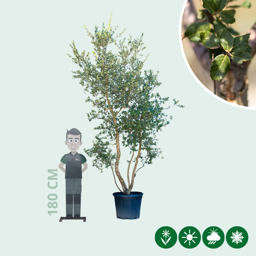 Die Korkeiche mehrstämmig ist ein wunderschöner, immergrüner Baum, der durch mehrere Zierwerte deutlich sichtbar ist. Die Korkeiche hat einen schönen, groben und romantischen Stamm. Dieser Mediterrane Baum verdankt seinen Namen "Korkeiche" den weichen Korkstreifen am Stamm. Diese Korkstreifen am Stamm werden auch als Kork für Weinflaschen verwendet und verarbeitet. Je älter die Korkeiche wird, desto mehr fällt der Baum durch den Stamm auf. In einem späteren Alter färbt sich die Rinde dieses Baumes rot / rosa.