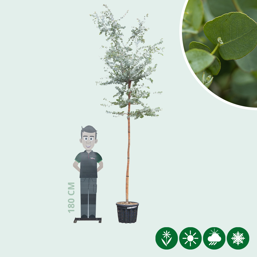 Wenn der Mostgummi-Eukalyptus etwas älter ist, kann er auch mit weißen oder cremefarbenen Blüten blühen. Der Baum blüht dann im Juni und Juli. Der Mostgummi-Eukalyptus wächst in unserem Klima gut. Allerdings verträgt er keine sehr strengen Fröste, aber am richtigen Standort ist der Baum frostbeständig bis -15 Grad Celsius. Dieser Baum bevorzugt einen sonnigen oder halbschattigen Standort mit gut durchlässigem Boden. Dieser Eukalyptus kann von April bis zum Frühsommer beschnitten werden. Der Mostgummi-Eukalyptus kann als Kübelpflanze verwendet oder ins Freiland gepflanzt werden.