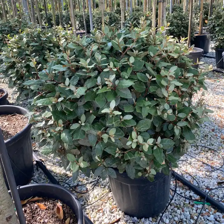 Die niedrige Kugel-Ölweide ist ein kompaktes, kugelförmiges Exemplar der Elaeagnus ebbingei, das sich ideal für niedrige, dichte Bepflanzungen in Ihrem Garten eignet.