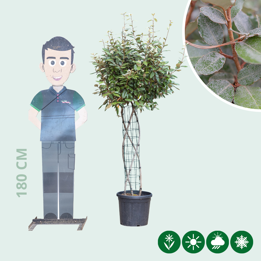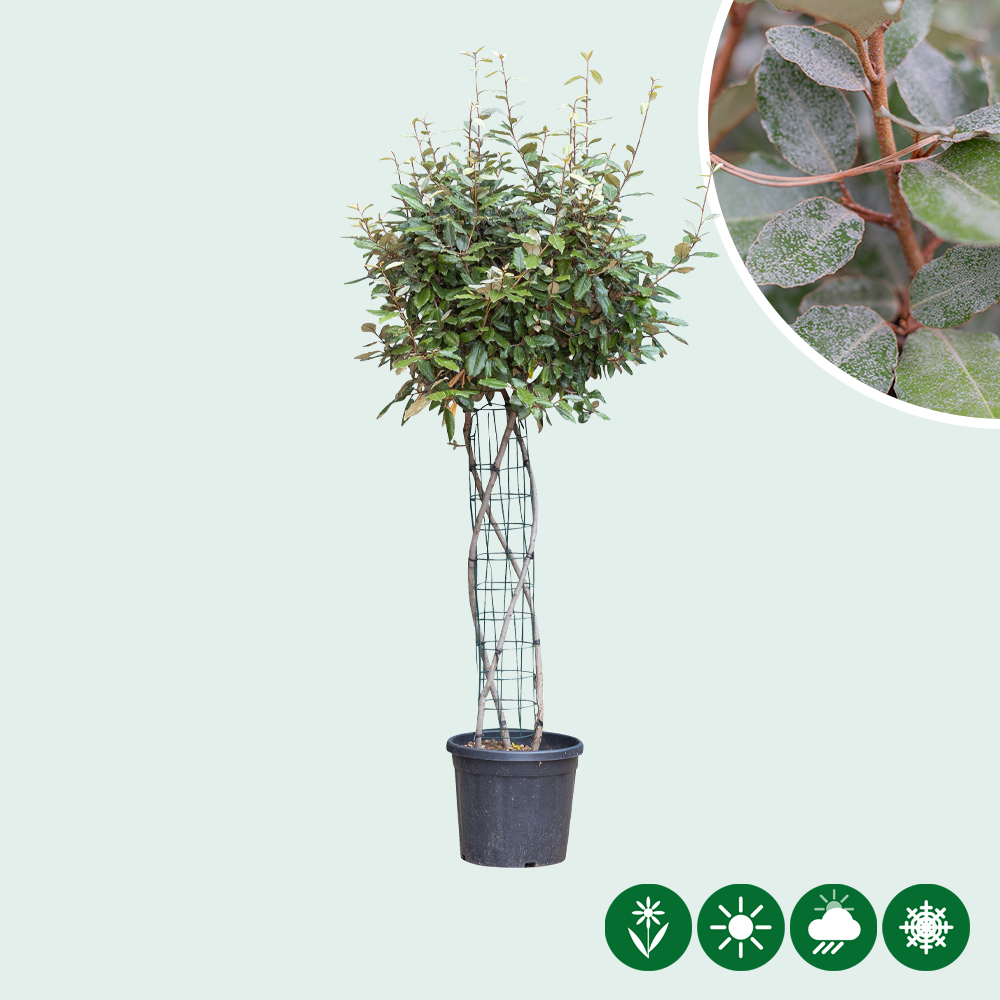 Dieser Kugelbaum ist auch leicht zu pflegen: Schneiden Sie diese kugelförmige Ölweide Ende März, wenn es keine Chance mehr auf starken Frost gibt. Schneiden Sie die Olivenweide wieder zu einer runden Form zurück. Diesen Schnitt wiederholen Sie ggf. auch noch einmal im Juni/Juli. Weiters ist es ein winterharter Baum, der sich für jede Art von Garten eignet.