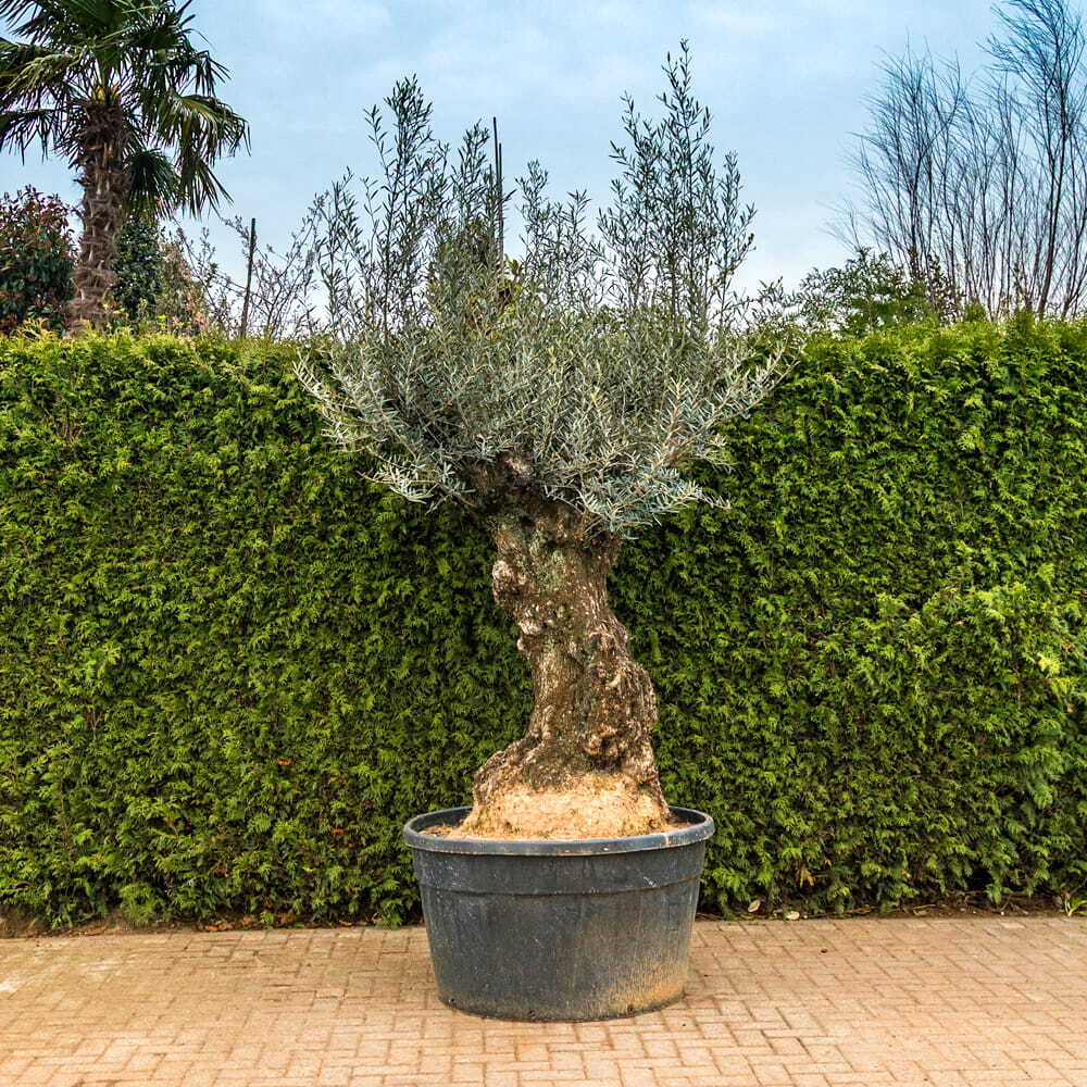 Die Olivenbäume kommen aus dem Mittelmeerraum und sind einer der ältesten Bäume der Welt. Die Blätter dieses mediterranen Baums sind unten grau und oben grün. Der Olivenbaum wechselt seine Blätter alle drei Jahre aus. Je älter dieser Baum ist, desto unberechenbarer ist sein Wachstum und die Formgebung. Die Unberechnbarkeit und die Formgebung geben einen schönen charakteristischen Effekt.