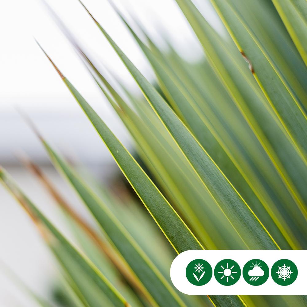 Diese Palmlilien kommen aus Spanien und sind gut im Topf verwurzelt, wodurch sie für das deutsche Klima besser geeignet sind als die weniger verwurzelten Palmlilien, die aus Südamerika importiert werden.