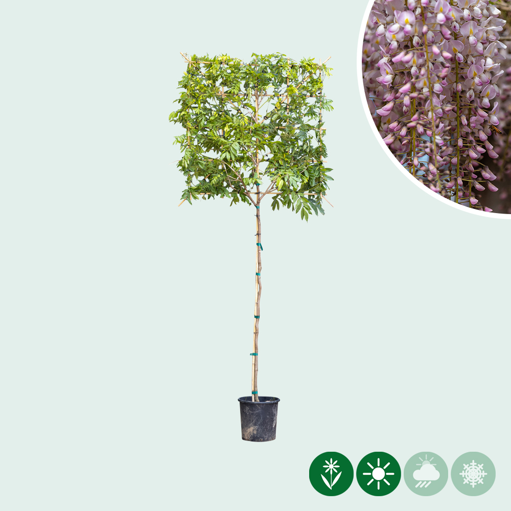 Die Wisteria sinensis ‘Rosea’ als Spalierpflanze ist eine sommergrüne Kletterpflanze, die an einem Gerüst entlanggeführt wird. Im Mai erscheinen lange Trauben mit zartrosa Blüten, die einen angenehmen Duft verströmen. Manchmal folgt im September eine zweite Blüte. Die rosafarbene Glyzinie wächst kräftig, sodass das Spalier schnell dicht bewachsen ist. Durch die Spalierform eignet sich diese Pflanze ideal für eine Wand oder Fassade und verleiht dem Garten eine romantische und elegante Ausstrahlung.