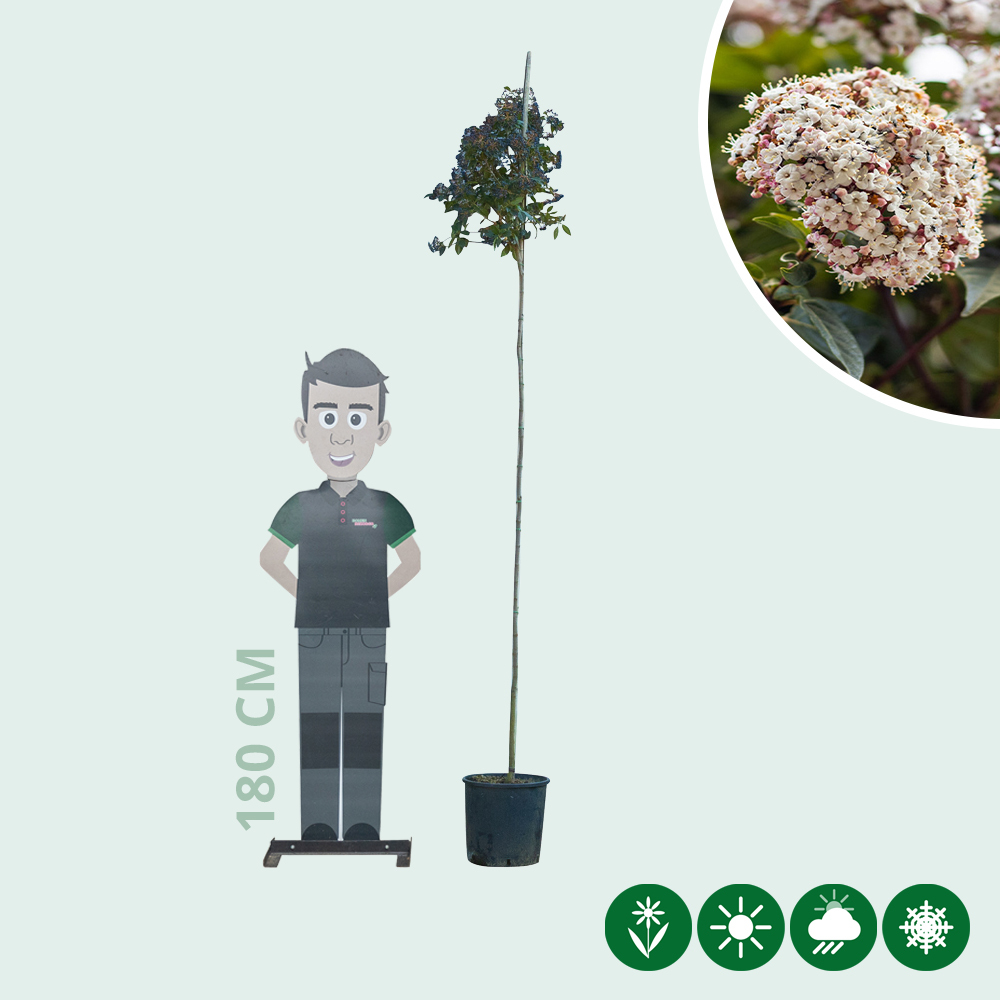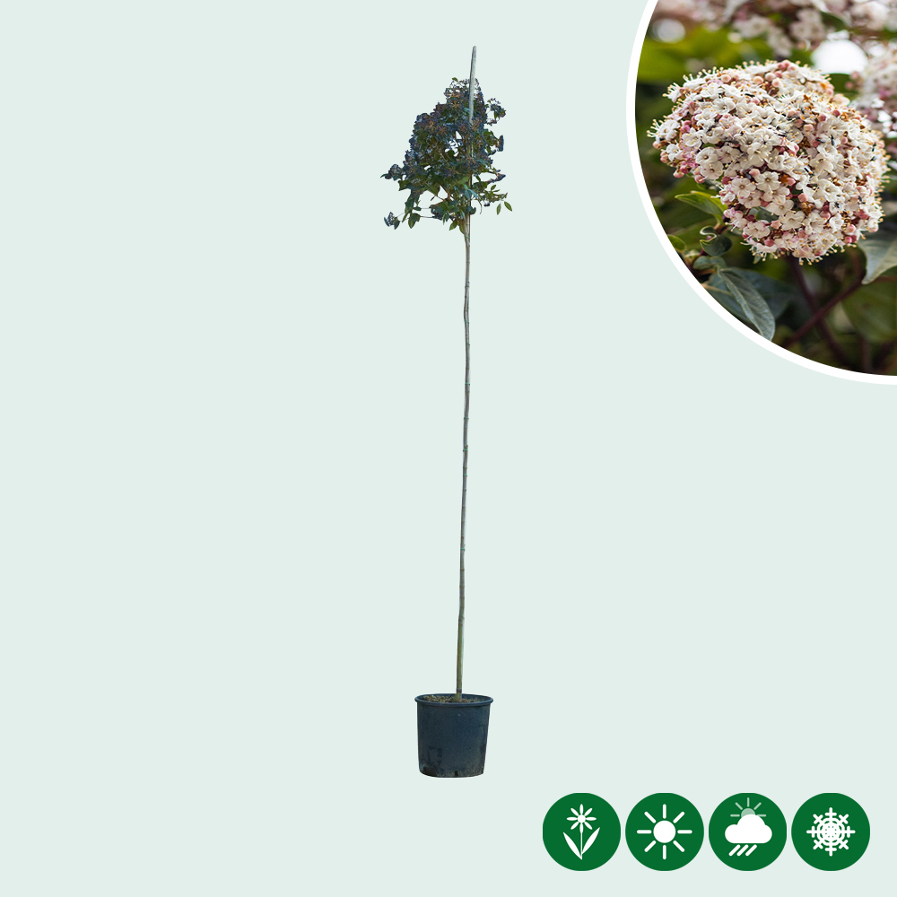 Die Gesamthöhe von der Schneeball Hochstamm beträgt von 300 - 320 cm und hat einen Stammumfang von 4 - 8 cm.