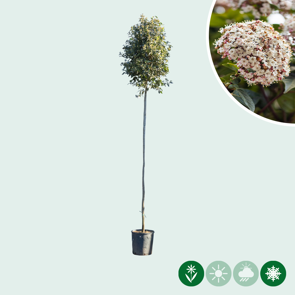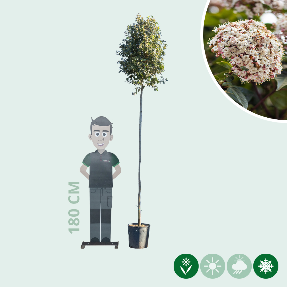 Die Gesamthöhe des Schneeball-Hochstamms beträgt 300 - 320 cm und hat einen Stammumfang von 8 - 10 cm.