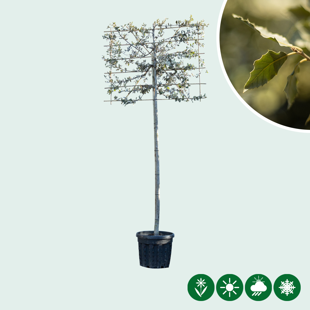 Durch ihre feine Verzweigung ist die Steineiche leicht zu beschneiden. Schneiden Sie dieses Spalier Ende März oder April, wenn kein extremer Frost mehr zu erwarten ist. Schneiden Sie die Eiche dann wieder in die Spalierform zurück. Achten Sie darauf, nicht zu viele Äste abzuschneiden. Die immergrüne Steineiche ist für mittelgroße und große Gärten geeignet.