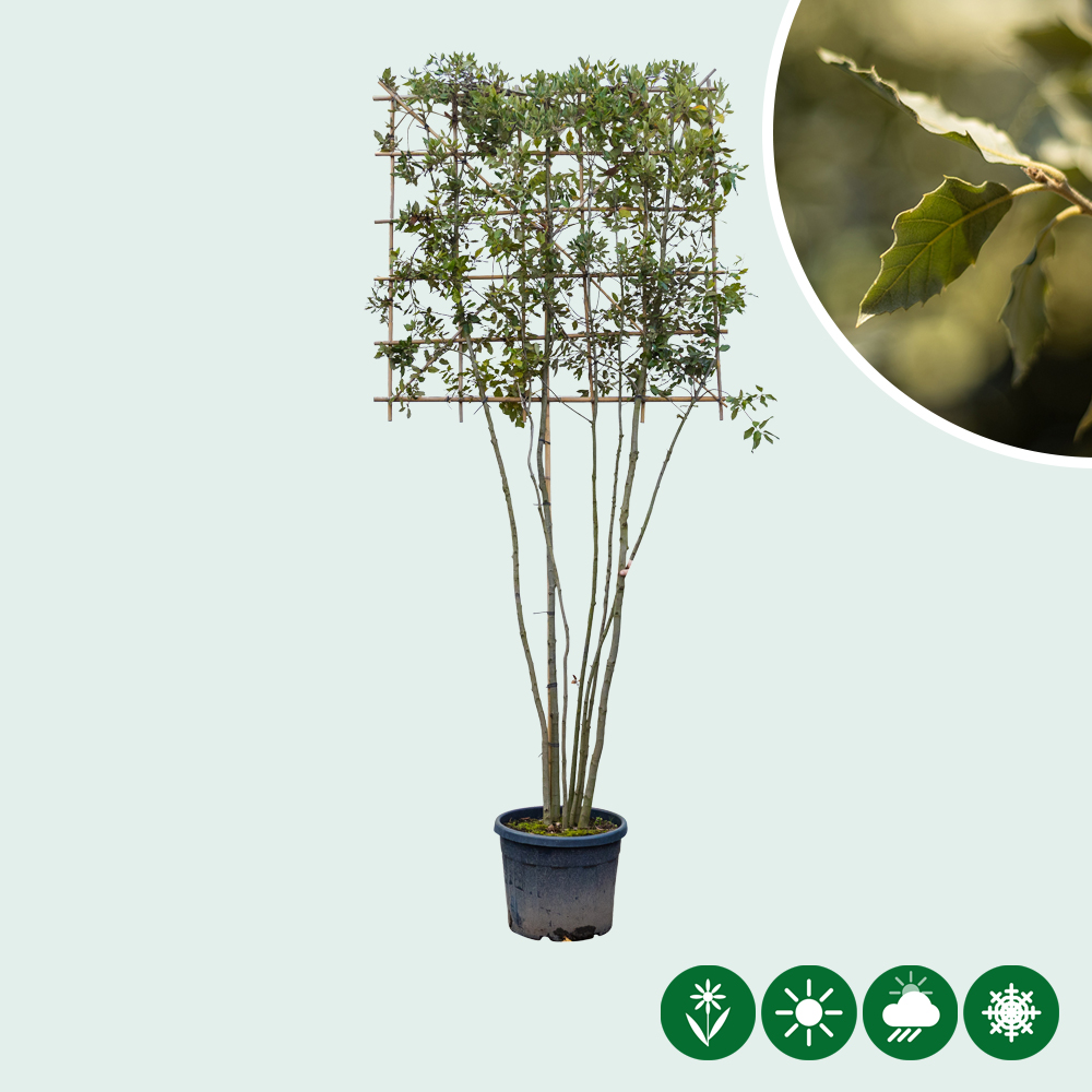 Die Quercus ilex ist sehr windfest und bevorzugt einen sonnigen Standort. Die dichte Verzweigung macht diese mehrstämmige Spalierform ideal für zusätzliche Privatsphäre im Garten. Dank des kräftigen Wuchses und der stabilen Struktur wird die Stein Eiche häufig als Spalier, aber auch als Säule, Block oder Zylinder eingesetzt.
