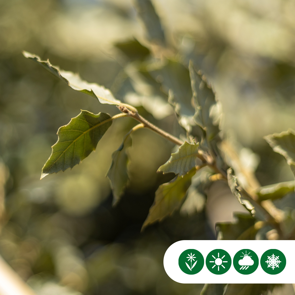 Das Laub der mehrstämmigen Steineiche in Spalierform ist fest, glänzend und lanzettlich. Die Oberseite ist dunkelgrün, während die Unterseite einen weißgrauen Schimmer hat. Diese Farbkombination sorgt für ein ruhiges und harmonisches Gesamtbild, besonders wenn der Wind durch das Spalier weht. Die Stein Eiche ist immergrün und behält ihr Laub das ganze Jahr über. Dadurch bleibt die Spalierform auch im Winter dicht und funktional.