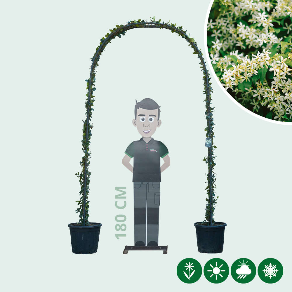 Die Sternjasmin bleibt das ganze Jahr über grün und behält ihr Laub, sodass der Bogen auch im Winter eine volle Ausstrahlung hat. Dadurch entsteht auf einfache Weise mehr Privatsphäre und eine romantische Atmosphäre im Garten. Außerdem ist die Pflanze attraktiv für Bienen und Schmetterlinge, sodass rund um den Bogen mehr Leben zu sehen ist. Mit diesem grünen Bogen aus Toskanischer Jasmin holt man die Natur ein Stück näher heran.